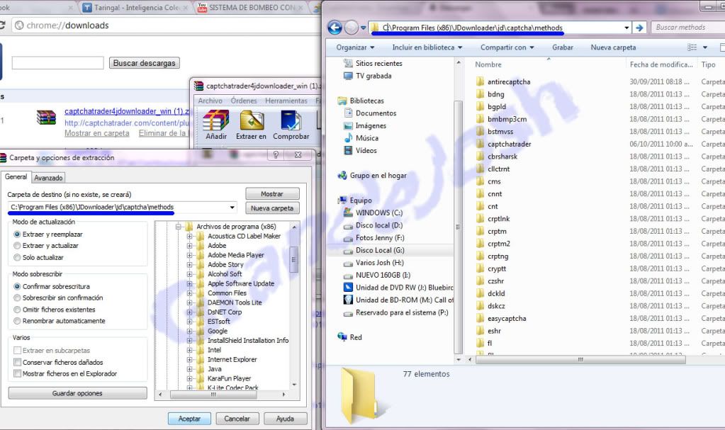 una ves descargado lo abrimos y extraemos todo el contenido dentro de esta carpeta C:/Program Files (x86)JDownloaderjdcaptchamethods